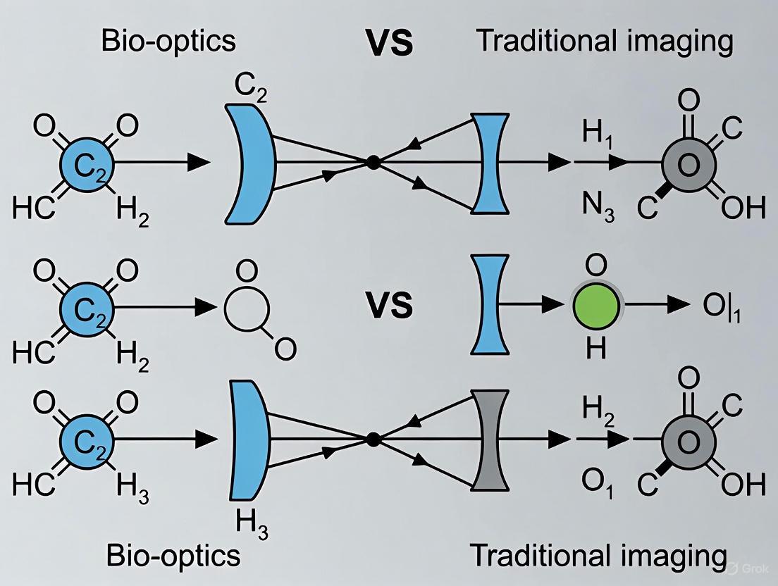 This article provides a comprehensive comparison between bio-optics—the convergence of light-based technologies with biology—and traditional imaging modalities for an audience of researchers, scientists, and drug development professionals.