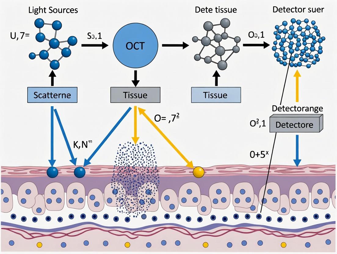 The interaction of near-infrared light with tissue is governed by absorption and scattering. In OCT imaging of epithelial tissues (e.g., breast, skin, colon), scattering dominates. The key parameters are: