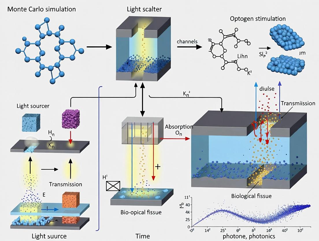 Materials: Acute brain slice, patch-clamp rig, movable optical fiber, MC simulation software, tissue optical properties.