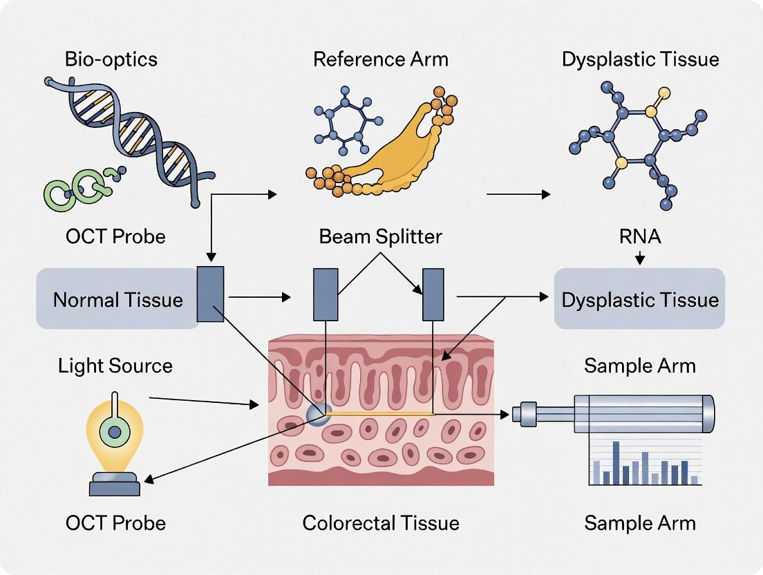 This article provides a comprehensive examination of Optical Coherence Tomography (OCT)-guided biopsy for the management of colorectal dysplasia, tailored for researchers, scientists, and drug development professionals. We explore the foundational principles of OCT contrast in dysplastic tissues, detailing the technological basis and light-tissue interactions. The methodological section outlines current clinical workflows, imaging protocols, and integration with endoscopic platforms for targeted biopsy. We address key challenges in image interpretation, artifact mitigation, and procedural optimization. Finally, we present a critical analysis of validation studies, comparing OCT-guided biopsy against standard histopathology and emerging techniques like confocal laser endomicroscopy. The conclusion synthesizes the translational potential of this technology for improving diagnostic accuracy, guiding therapeutic development, and personalizing surveillance strategies in inflammatory bowel disease (IBD) and colorectal cancer screening.